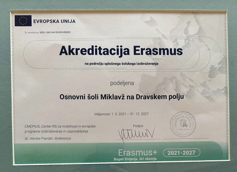 Naša šola je v 2021 pridobila Erasmus akreditacijo v prvem krogu razpisa. Dodelitev Erasmus akreditacije potrjuje, da je institucija pripravila načrt za izvedbo visokokakovostnih aktivnosti mobilnosti v okviru širših prizadevanj za razvoj svoje organizacije v okviru nadaljevanja mednarodnega sodelovanja.